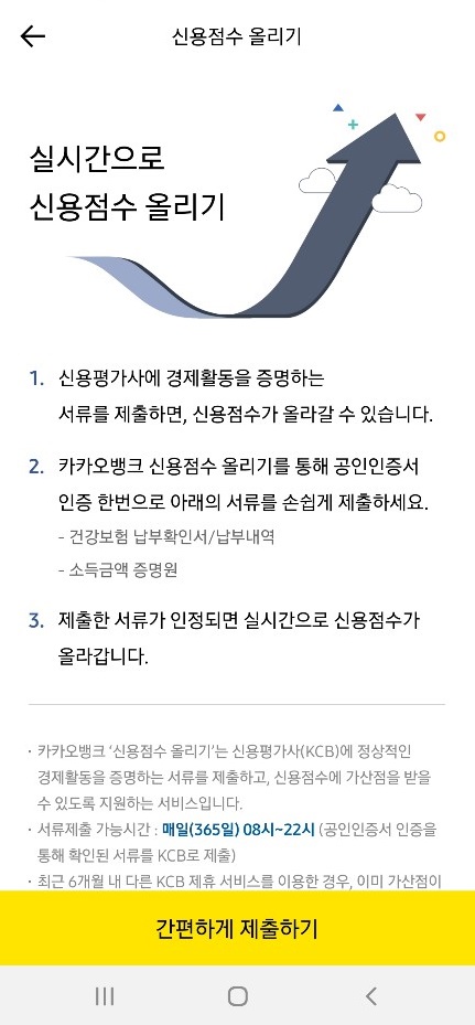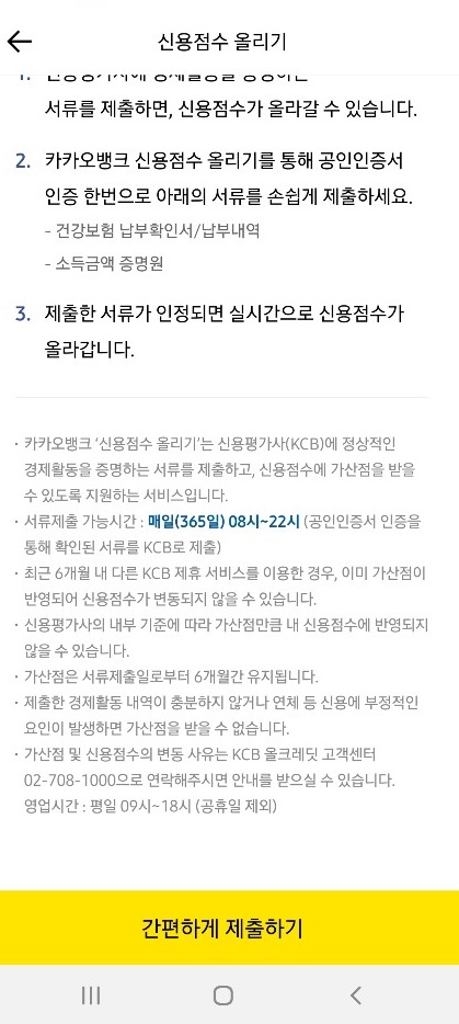 이 글을 보고 신용등급 조회 해 보신 분 중 신용점수 올리고 싶다면 카카오뱅크 신용점수 올리기를 통해서 공인인증서 인증해서 건강보험 납부확인서, 납부내역, 소득금액 증명원을 제출하고 이 서류가 인정되면 실시간으로 신용점수 올릴 수 있습니다.