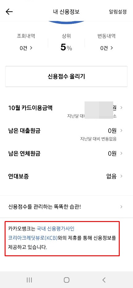 카카오뱅크 통한 신용등급 조회 라는 것은 국내 신용평가사인 코리아 크레딧뷰로와의 제휴를 통한 신용정보입니다. 신용등급에 영향을 미치는 것은 지금 위의 이미지에서 보면 카드이용금액과 남은 대출원금, 남은 연체원금, 연대보증 등일 수도 있는 듯 합니다.