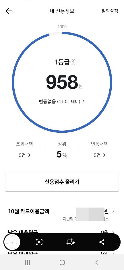 약간의 버퍼링 같은 순간이 1초안에 해결되면서 바로 자신의 신용등급 조회 할 수 있게 됩니다. 2020년 11월1일 대비 저는 958점으로 1등급입니다.