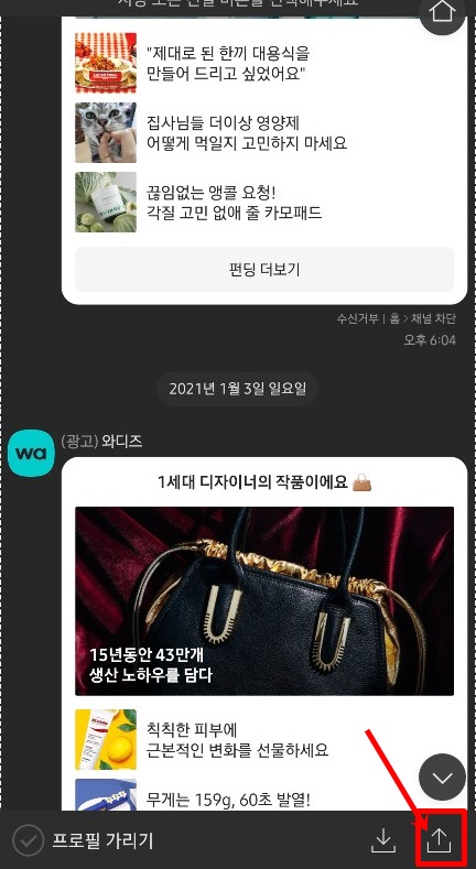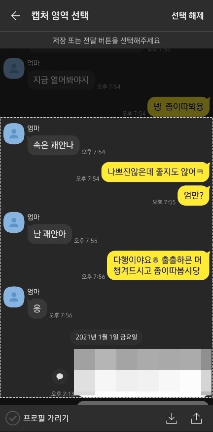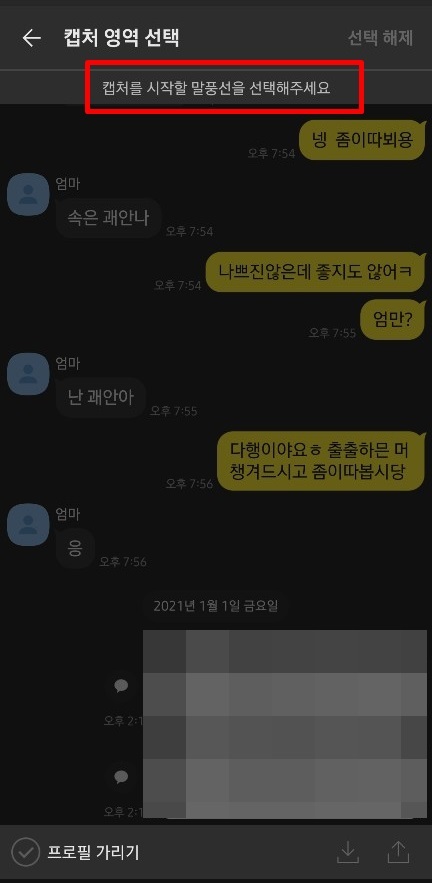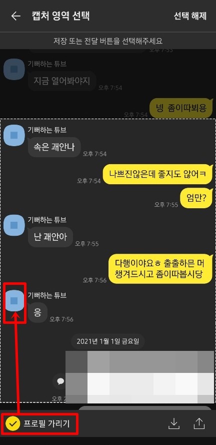 캡쳐를 시작할 말풍선을 선택하고 마지막 말풍선을 선택하면 점선으로 그 대화가 다 표시되면서 캡처 영역 선택 해주게 됩니다. 여기서 프로필 가리기 체크하면 프로필이 모자이크 처리가 됩니다. 이 캡처 화면을 저장할지 공유할지 화살표로 선택하면 끝입니다. 간단합니다.