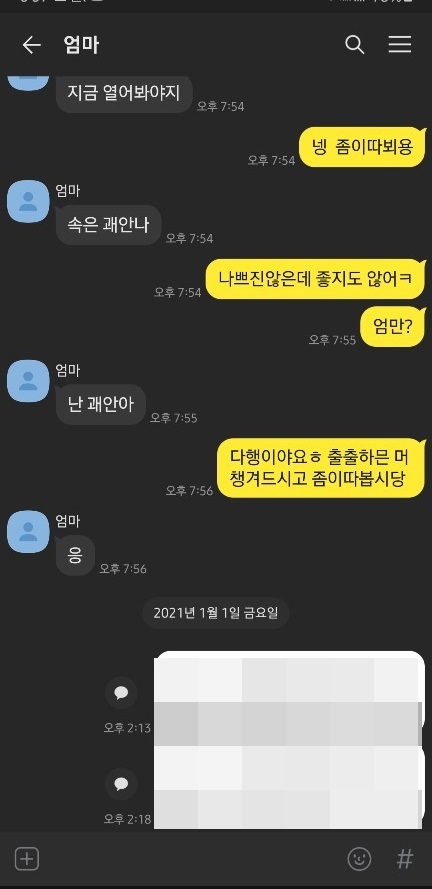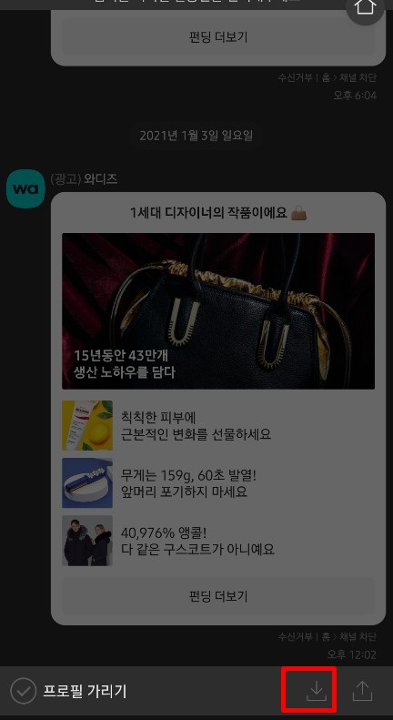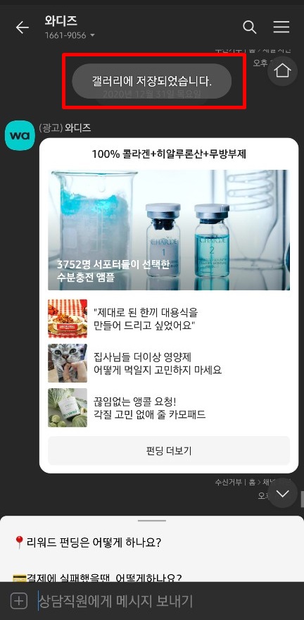 캡쳐한 화면을 저장하고 싶다면 화살표가 아래로 표시된 부분을 선택합니다. 바로 갤러리에 저장되었다는 팝업이 뜨고 원래 첫화면, 대화창 화면으로 바뀝니다.