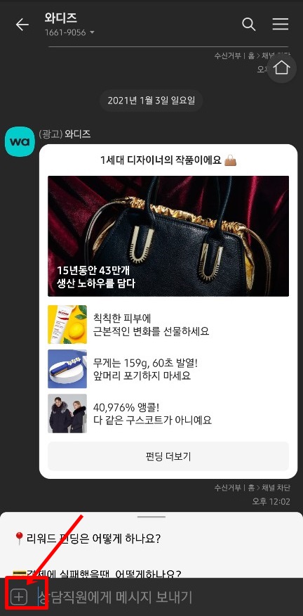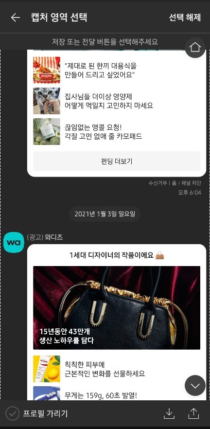 그러면 이제 카톡 화면 캡처 해 보겠습니다. 저는 일반적인 대화가 아니라 펀딩업체인 와디즈 창을 열어보았습니다. 와디즈에서 좋은 펀딩이 있다면 이것을 친구와 공유해볼 수 있겠죠? 하단의 대화입력창에서 < + > 눌러서 캡처 선택하면 캡처 시작할 대화의 말풍선 선택하고 마지막 말풍선도 선택합니다.