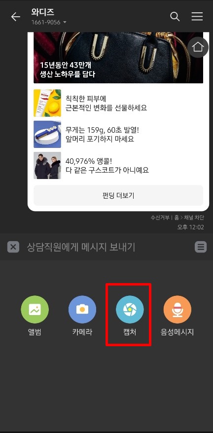 카톡 캡처하는 방법 1. 캡처 하려고 하는 대화창에 먼저 들어갑니다. 그리고 메시지를 보낼 대화입력창에 있는 + 를 콕 눌러줍니다. 그러면 바로 앨범, 카메라, 캡처 등의 더보기 창이 열립니다. 여기서 캡처 선택합니다.