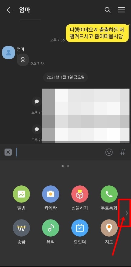 엄마랑 카톡 한 내용을 언니나 동생에게 보내려고 캡처 해 보았습니다. <+>눌렀더니 아까 위에서 와디즈와 했던 더하기창이 약간 다릅니다. 일반 대화창에는 앨범, 카메라, 선물하기, 무료통화, 송금, 뮤직, 캘린더, 지도까지 나와있어서 어? 캡처 없네? 했더니 오른쪽으로 화살표가 보이네요. 살짝 눌러 보았더니 캡처와 연락처 등이 더 보입니다. 여기서 캡처 선택합니다.